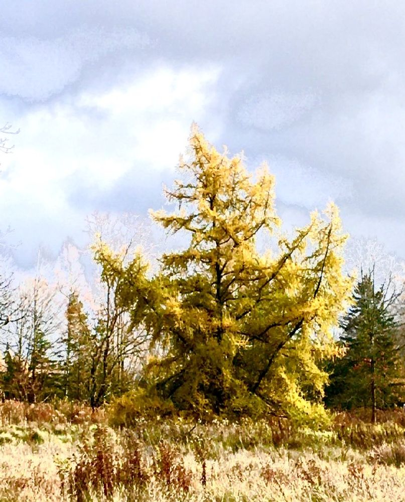 Further along the track a larch is brilliantly gold against the sky and the bare trunks of other trees. Goldfinches, drab in comparison in winter olive, flit among branches; chickadees feed low on the galls on goldenrod stems, the plants’ flowers, once as brilliantly yellow as the larch or as summer goldfinches, now turned to fawn fluff. Milkweed pods are stripped bare.