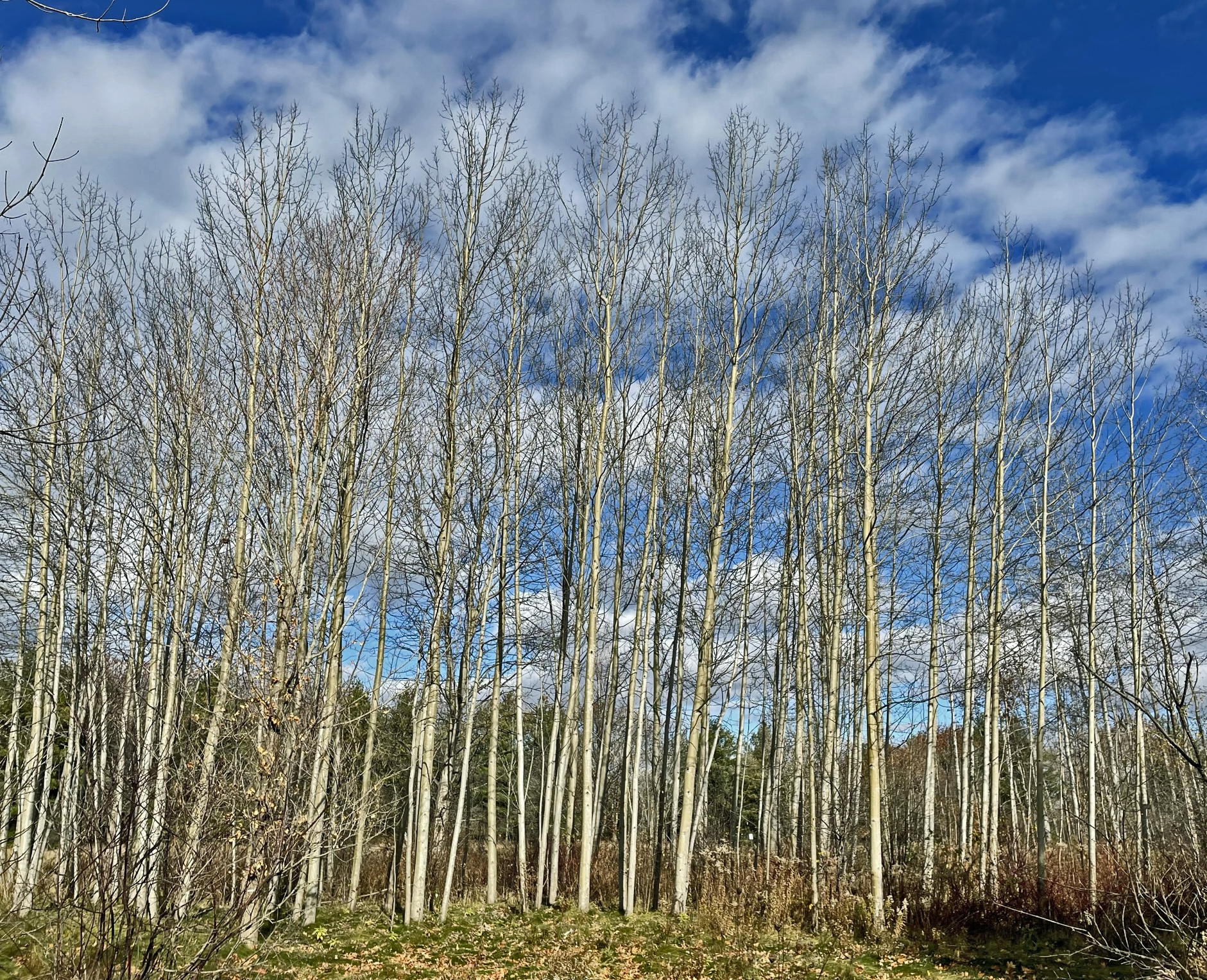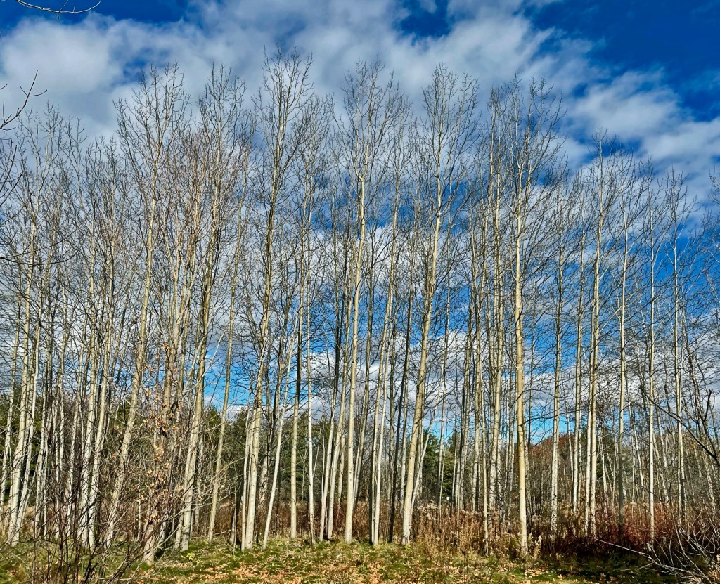 Cold and bright this morning, and quiet out in the fields and woods. The birches that look so white when viewed without comparison are creamier than the clouds. Birds that echo the birches’ colours — chickadees, juncos — are calling from the shelter of cedars.