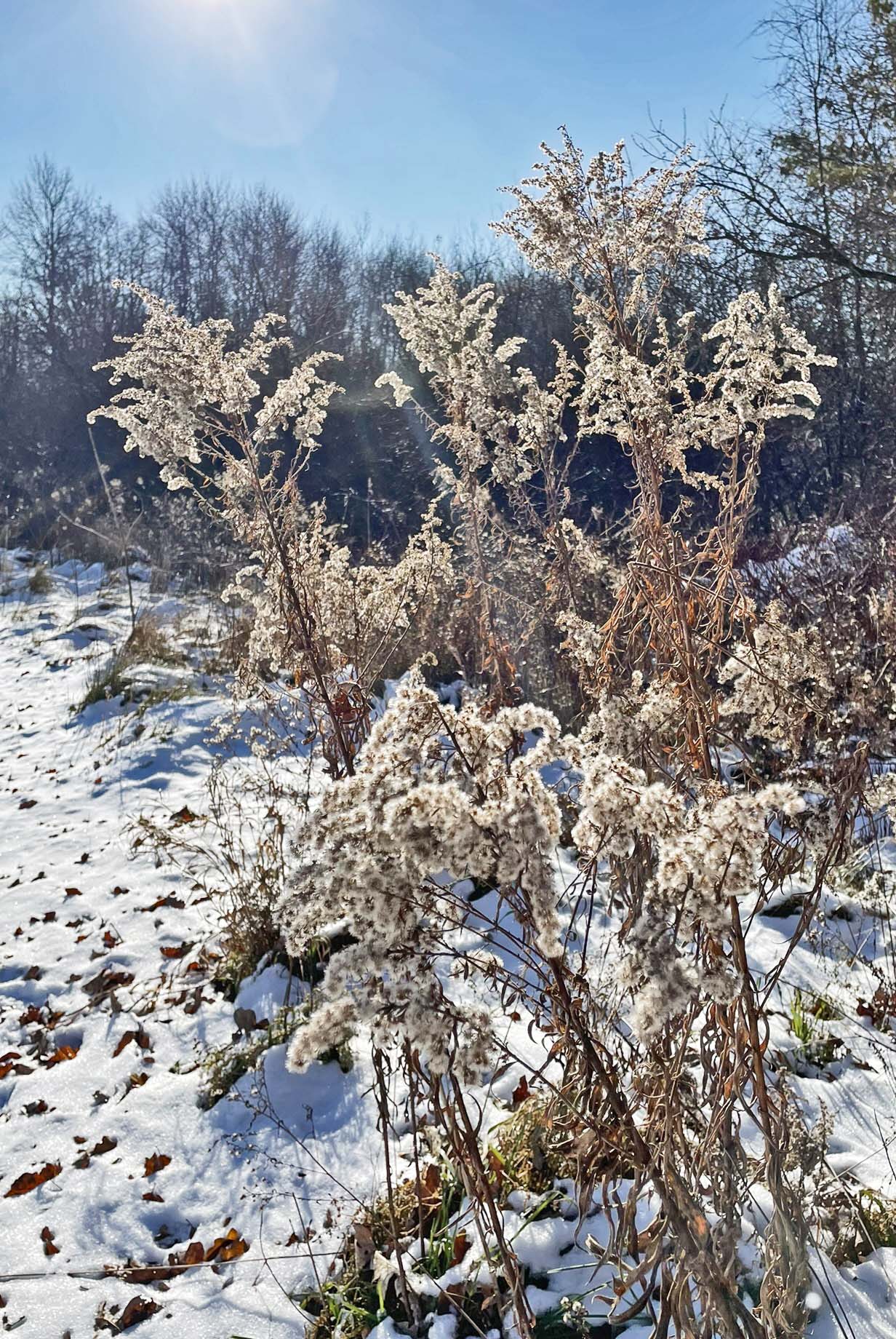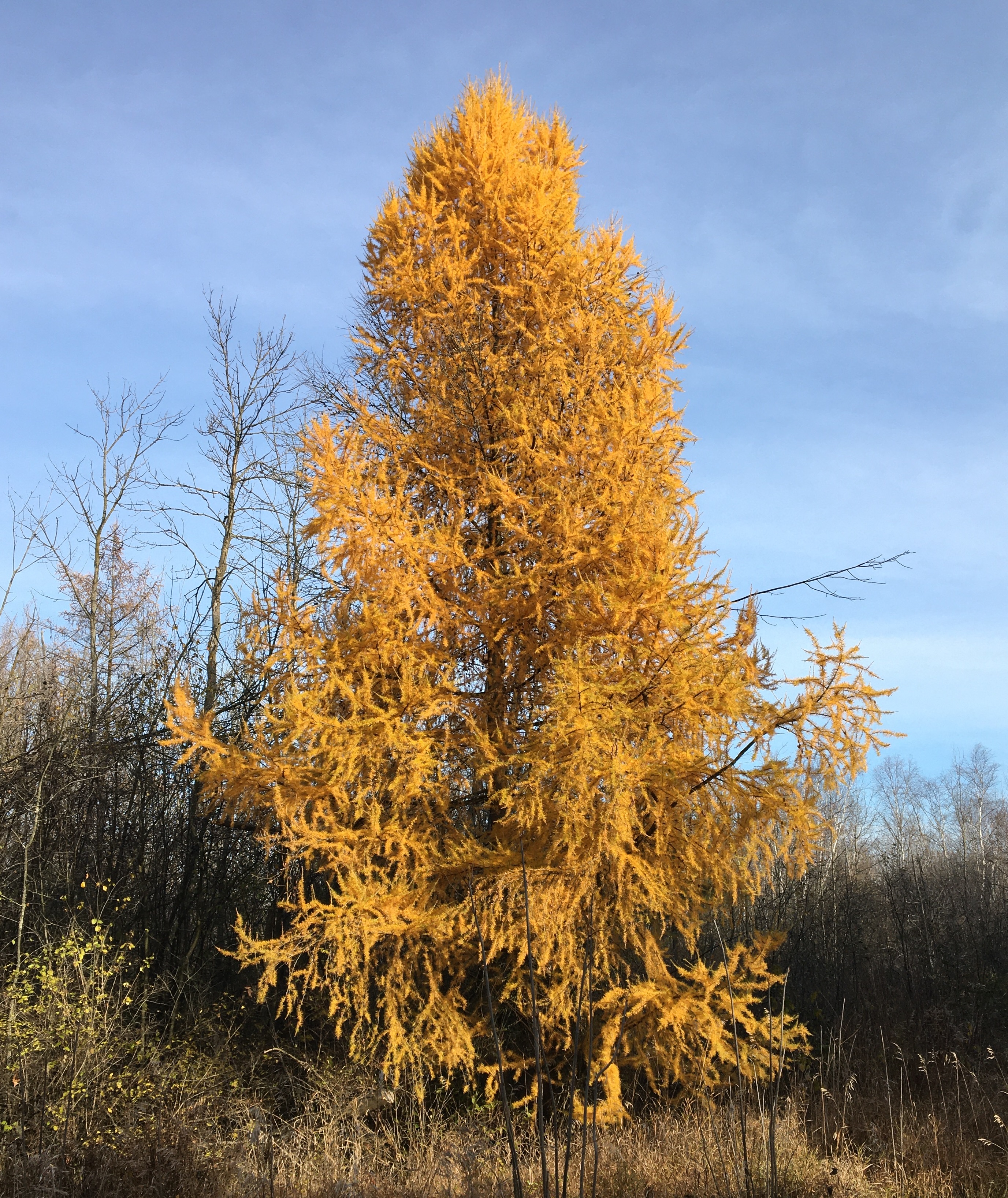 Further along the track a larch is brilliantly gold against the sky and the bare trunks of other trees. Goldfinches, drab in comparison in winter olive, flit among branches; chickadees feed low on the galls on goldenrod stems, the plants’ flowers, once as brilliantly yellow as the larch or as summer goldfinches, now turned to fawn fluff. Milkweed pods are stripped bare.