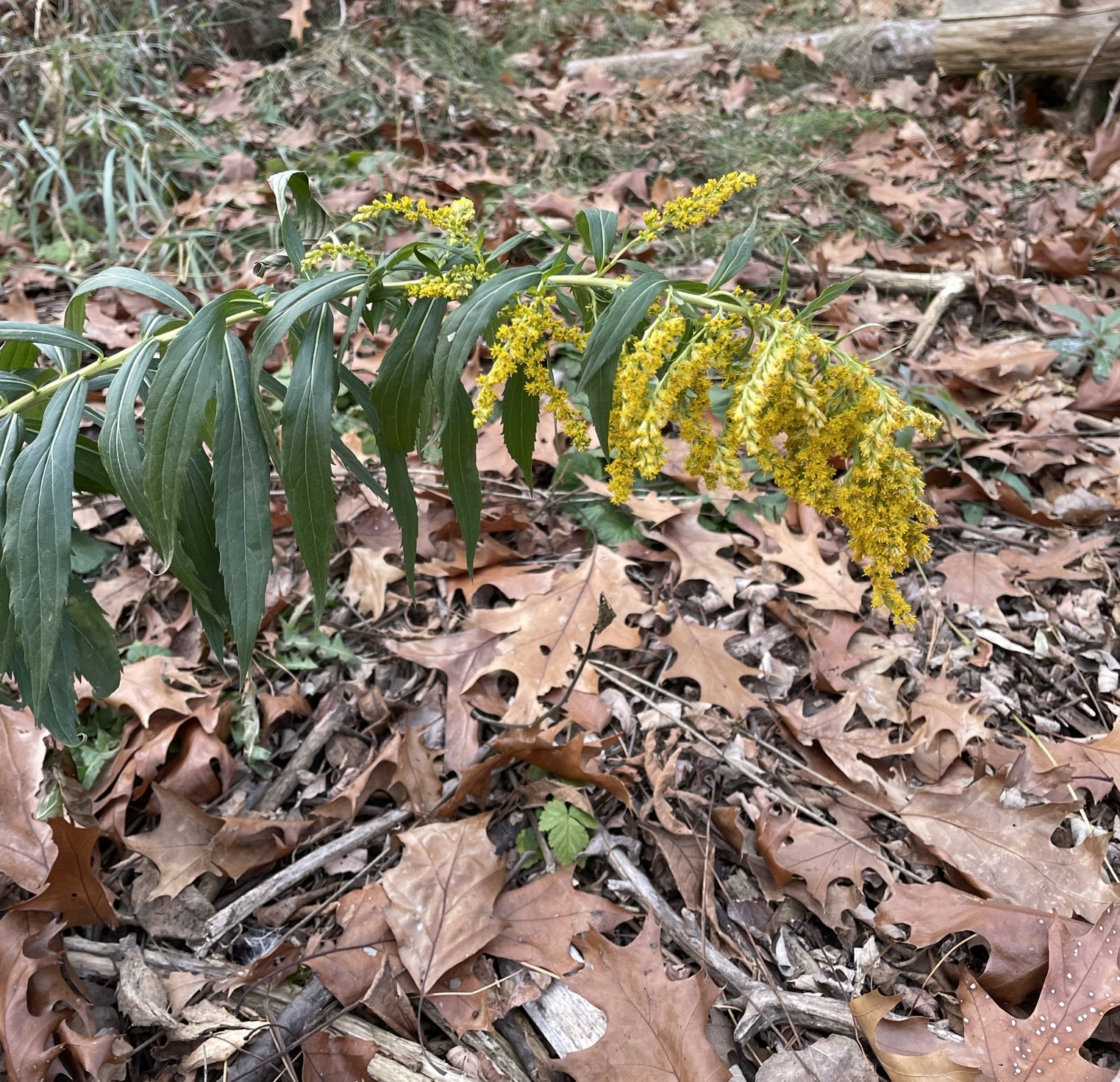 Regardless of the hard frost, a few goldenrod plants are still flowering, bright against the brown leaves. As are the bright red berries of a shrub I can’t identify. The goldenrod is wild, wind or bird seeded; the shrubs are planted. One is likely more appreciated than the others by humans, but I know which the chickadees prefer.