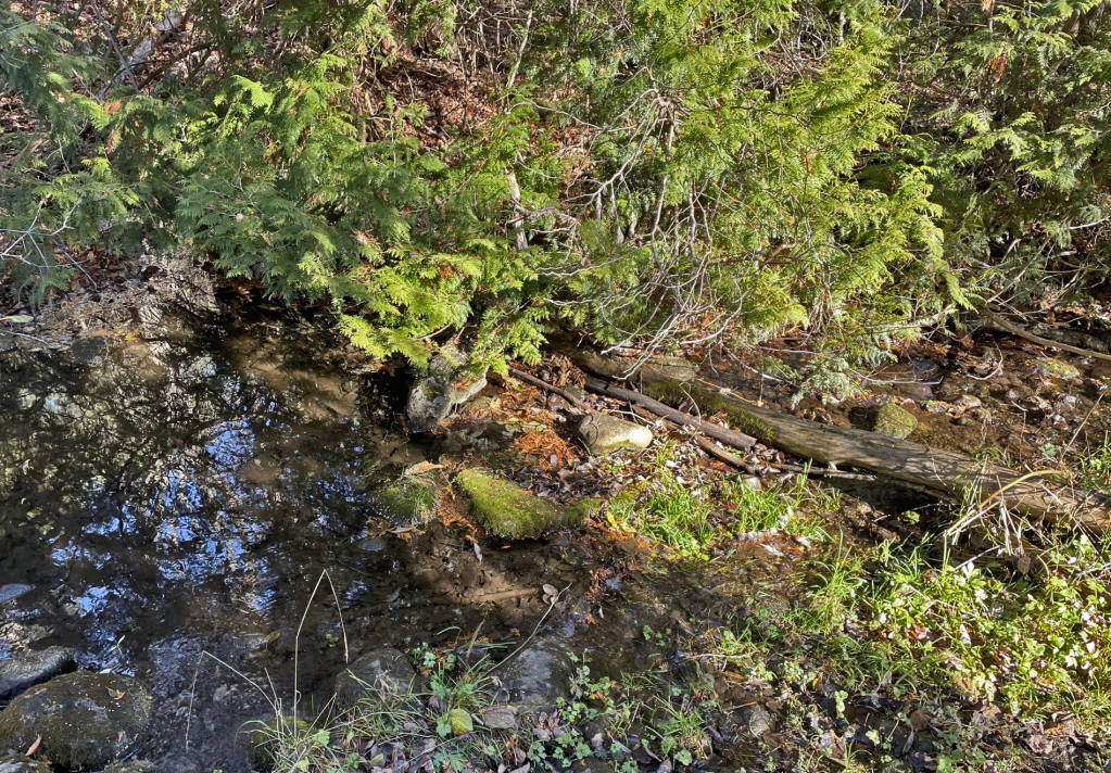 The path enters old deciduous forest, bordering an arm of the lake. Still silence here, except for the harsh cry of a red-bellied woodpecker, and another. The trail turns, drops down into cedars, and at a stream crossing there are, finally, chickadees, and the chip of juncos. The slowly-flowing stream is surrounded by green, even on this mid-November day.