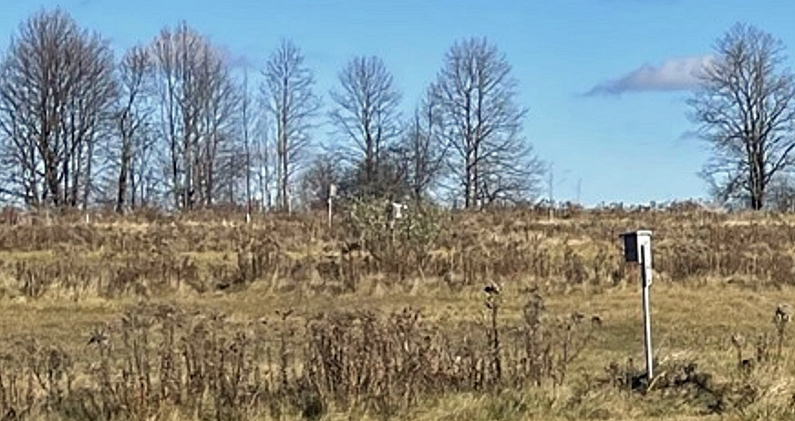 There should be a counting rhyme for bluebirds. One on the bluebird box, two in the sky… They are landing and leaving, one by one, from on top of nest box, CW64: the one in which they were raised? Or simply a convenient stop on the way to the trees by the little pond? I count seven there, before they flash away, cerulean and russet, and I lose track of them.