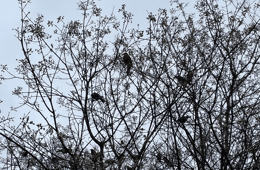 I’m hoping for brown creeper at the maple swamp, but I neither hear nor see one. But a deep ‘gronk’ breaks the silence, repeated three times, then another triplet call, then a third. I can’t see the raven, but it’s there—and the crows know it too, their mobbing call gathering more of their kind to harass the raven. A single unkindness, and suddenly a murder.