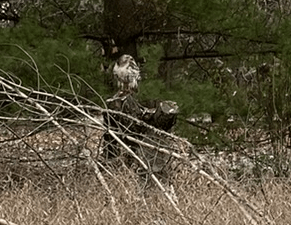 First snow, a bare sprinkling arriving mid morning. The air is crisp still at 10 am. I round a curve on one of my favourite paths and freeze. On a waist-high stump not more than 6 or 8 meters from me, a young red-tailed hawk is devouring a squirrel. (The picture below is a terrible record shot, but it’s the best my phone could do.)