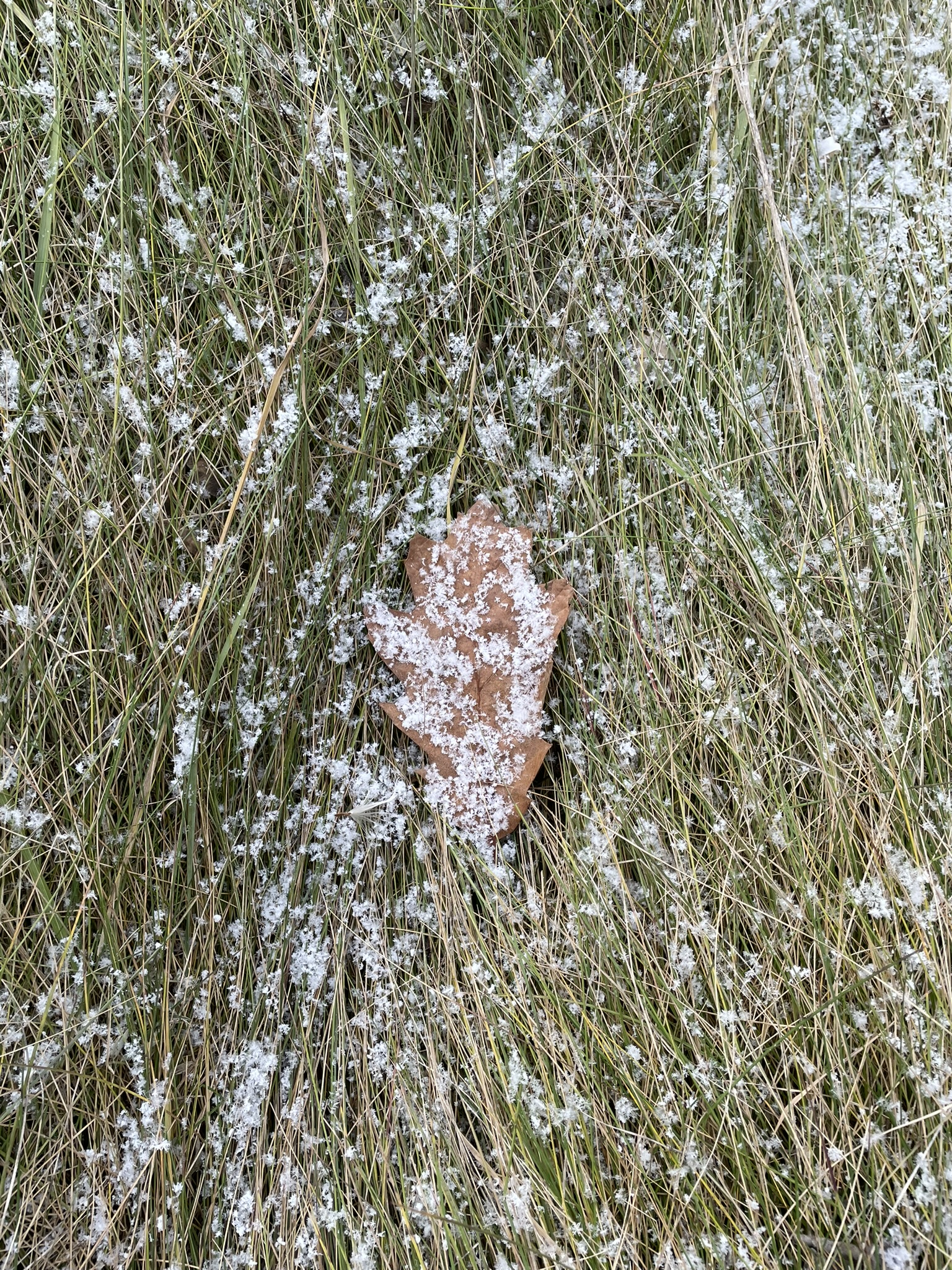 I walk my usual route, looking at the patterns of snowflakes on grass and leaves, hearing juncos and chickadees and crows. When I return to where the hawk was, forty minutes later, there is nothing but a few wisps of fur on the stump.