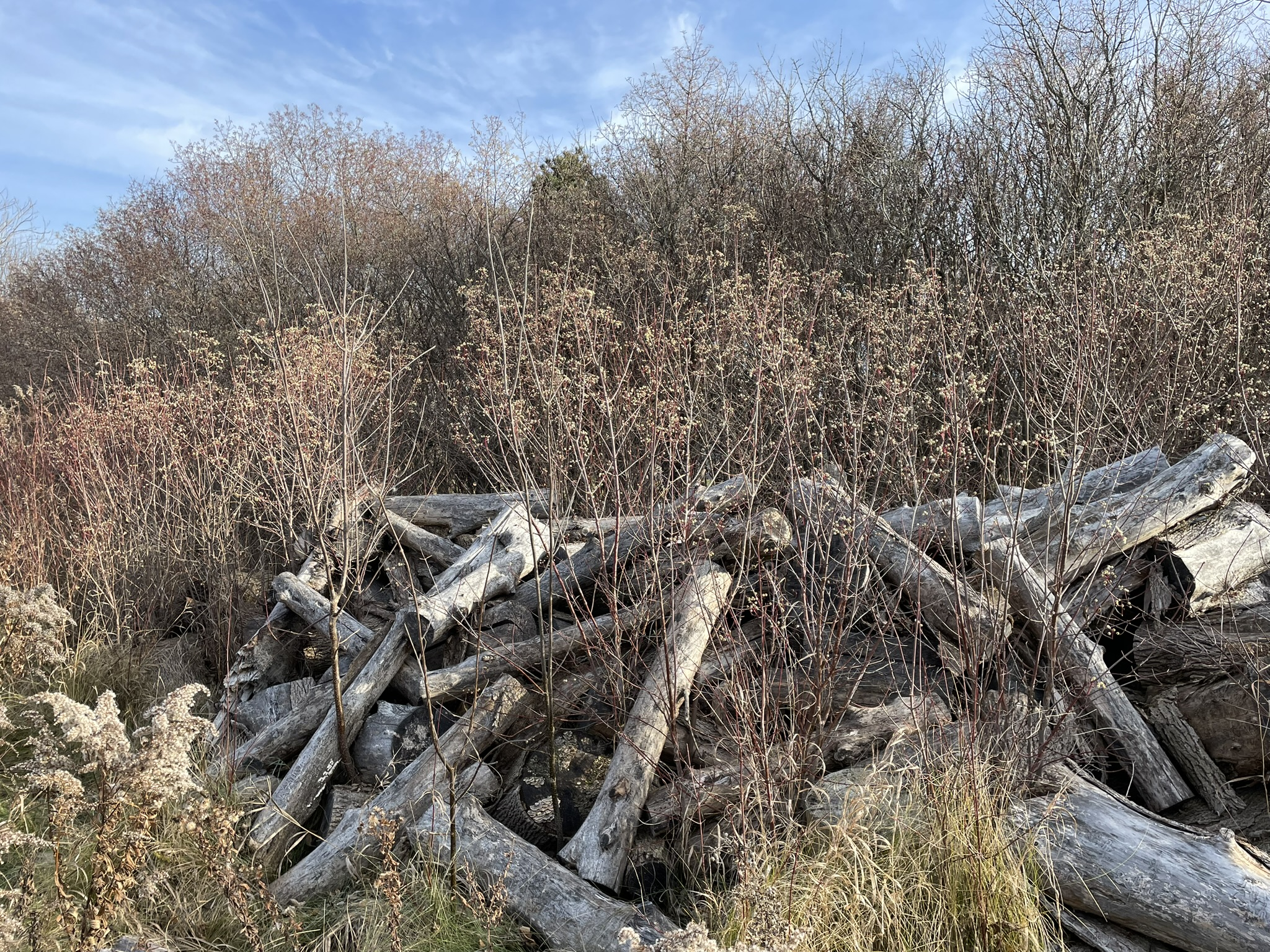 Still sluggish after my COVID shot, I walk slowly around my favourite paths. This location intrigues me: the pile of logs, the perennial plants, the white-berried shrubs (gray dogwood again?) behind them makes for excellent habitat. (The shrubs are full of cardinals this morning, feeding.) If there’s snow on the ground before we leave for England in early January, I’ll come back here to look at the tracks leading in and out of the logpile, to see what stories they tell.