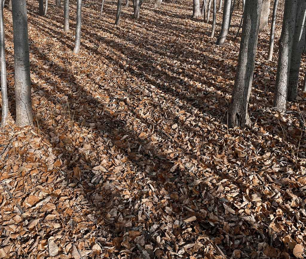 Long shadows, even mid-morning. Thirty-two days to the winter solstice. The woods are quiet, not even a chickadee calling. Leaves crunch underfoot.