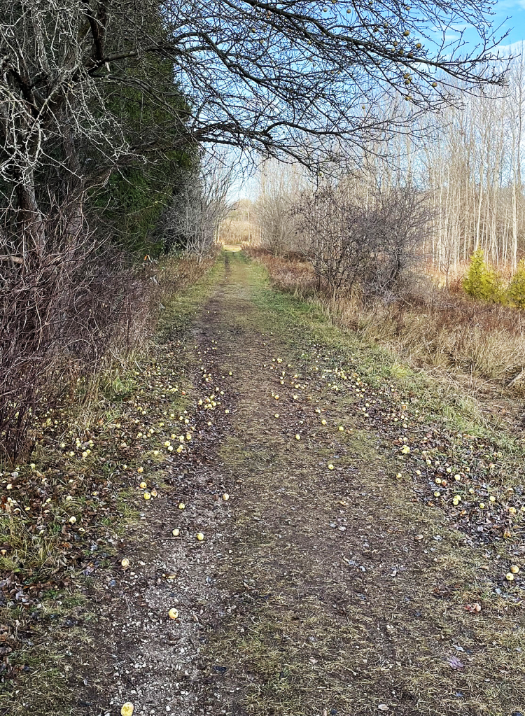 Scattered along the old fencelines are apple trees, chance-grown from apple cores tossed by a farm worker or buried by a squirrel. The apples still hanging glow yellow in the bare branches, like Christmas ornaments; more lie beneath the trees. Little seems to have eaten them: no foxes, no coyotes? On the paths where I usually walk, evidence of fruit consumption is clear wherever there is coyote scat (and it’s always in the middle of the trail); not here, further away from the city. Why?