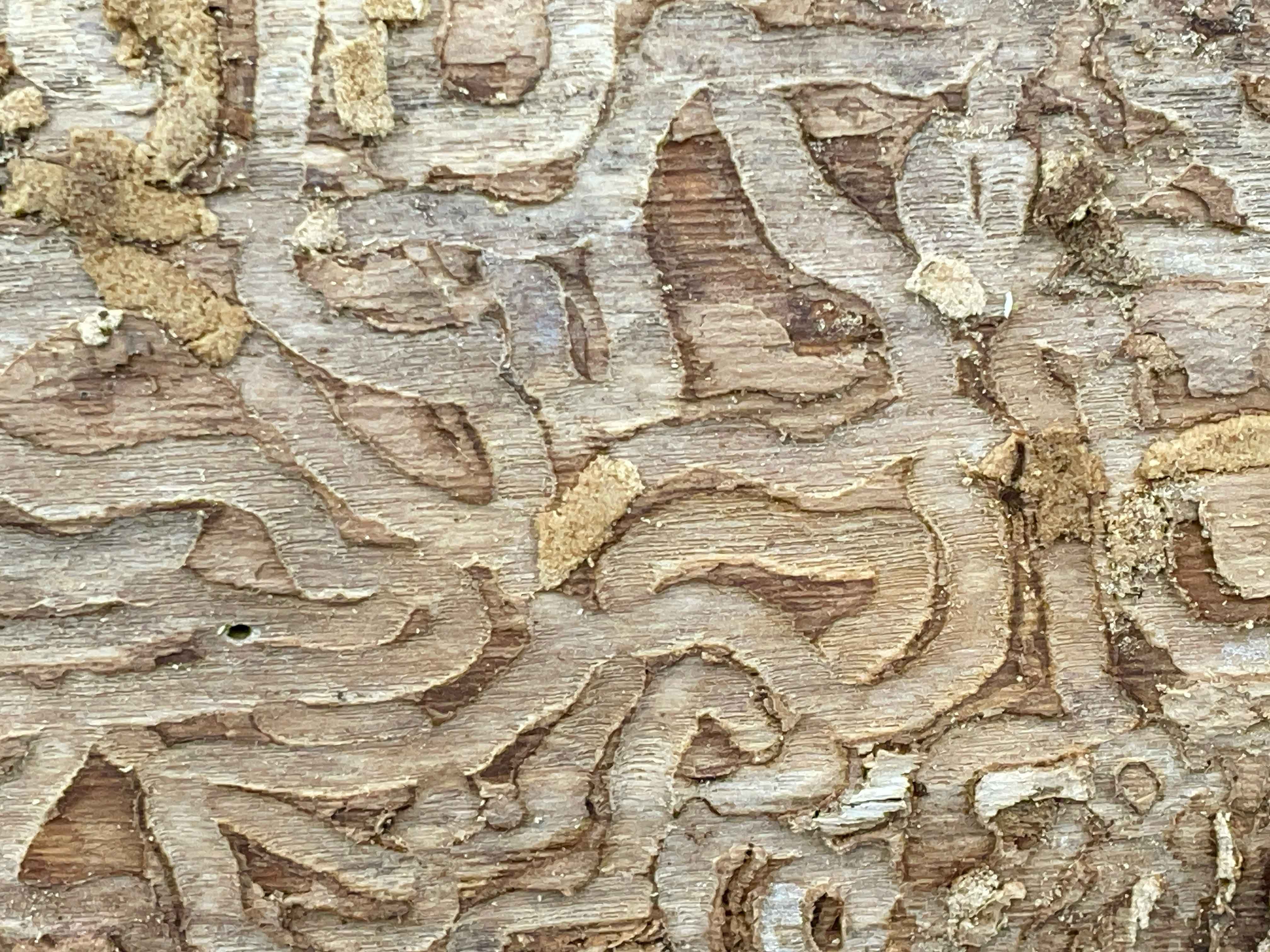 Hidden behind bark—until it loosens and falls—bark beetles create mazes of intertwining paths on the phloem, a traced, random, undecipherable writing, telling a tale of slow death for the tree, life for the beetle. The Janus-faced interdependence of life and death.