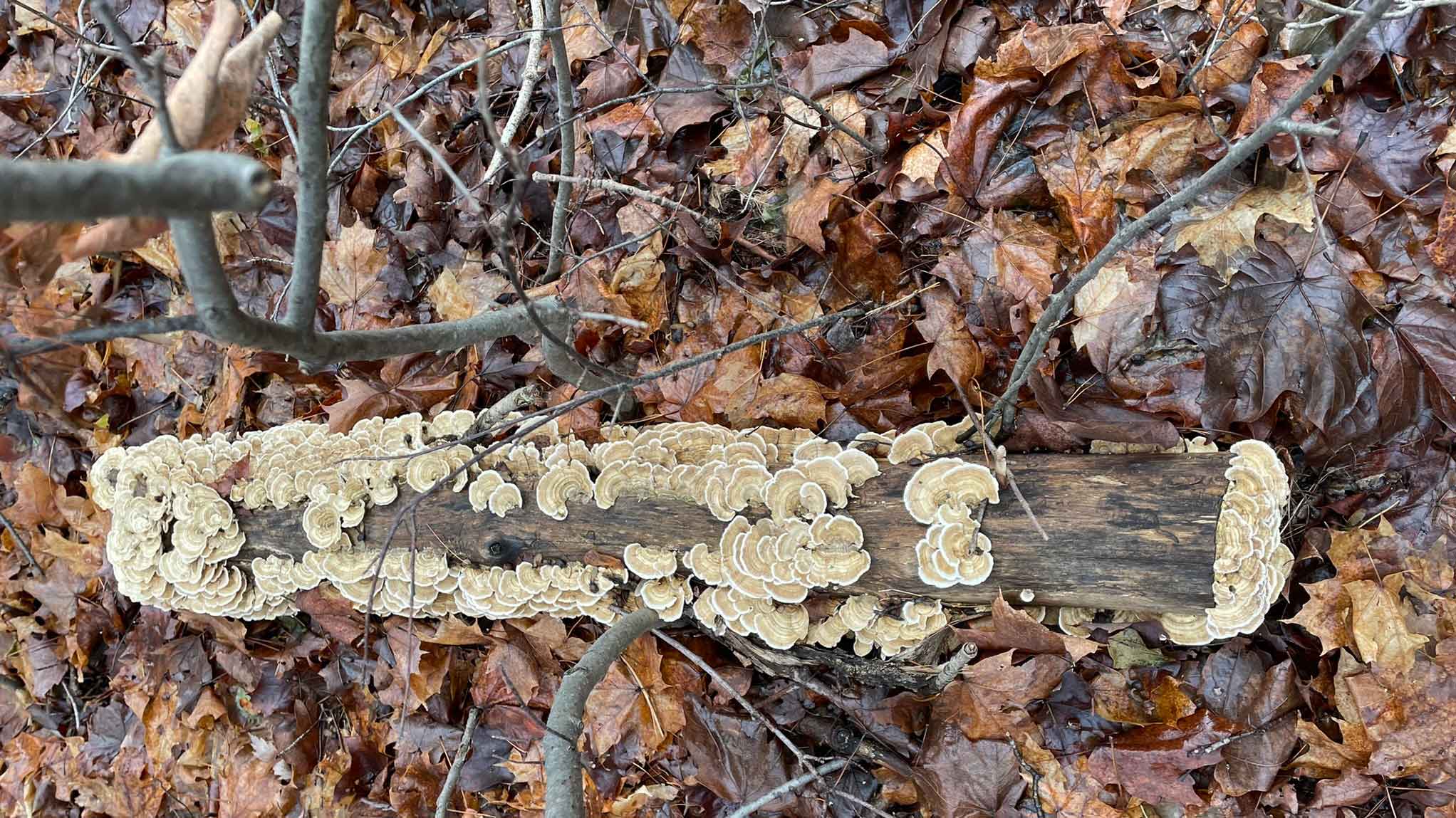 In these shortening days of December, the fecundity of summer gone and the world laid bare, the processes of decay—a word loaded with negative meanings—are on display. Saprophytes are working their necessary transformation on wood both fallen and standing; unlike the brief fruiting bodies of mushrooms that appear in the autumn, these fungi aren’t ephemeral. They spread along trunks and across fallen logs, lines and layers of living tesserae, rippled and curved.