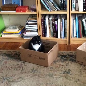 She is sitting in boxes, sitting in empty shelves, watching every move, stalking around investigating everything. The last time we boxed up all these books, we were renovating…and then half-way through that summer I had major surgery, and returned to be in bed much of each day for a few weeks – something she thought was the ideal way to spend time. Is she remembering that? Or is she remembering being cloistered in the attic for most of each day while we wall-papered and panelled and painted? Whatever is going on in her little black and white head, she knows something is different, and she’s not sure she likes it.